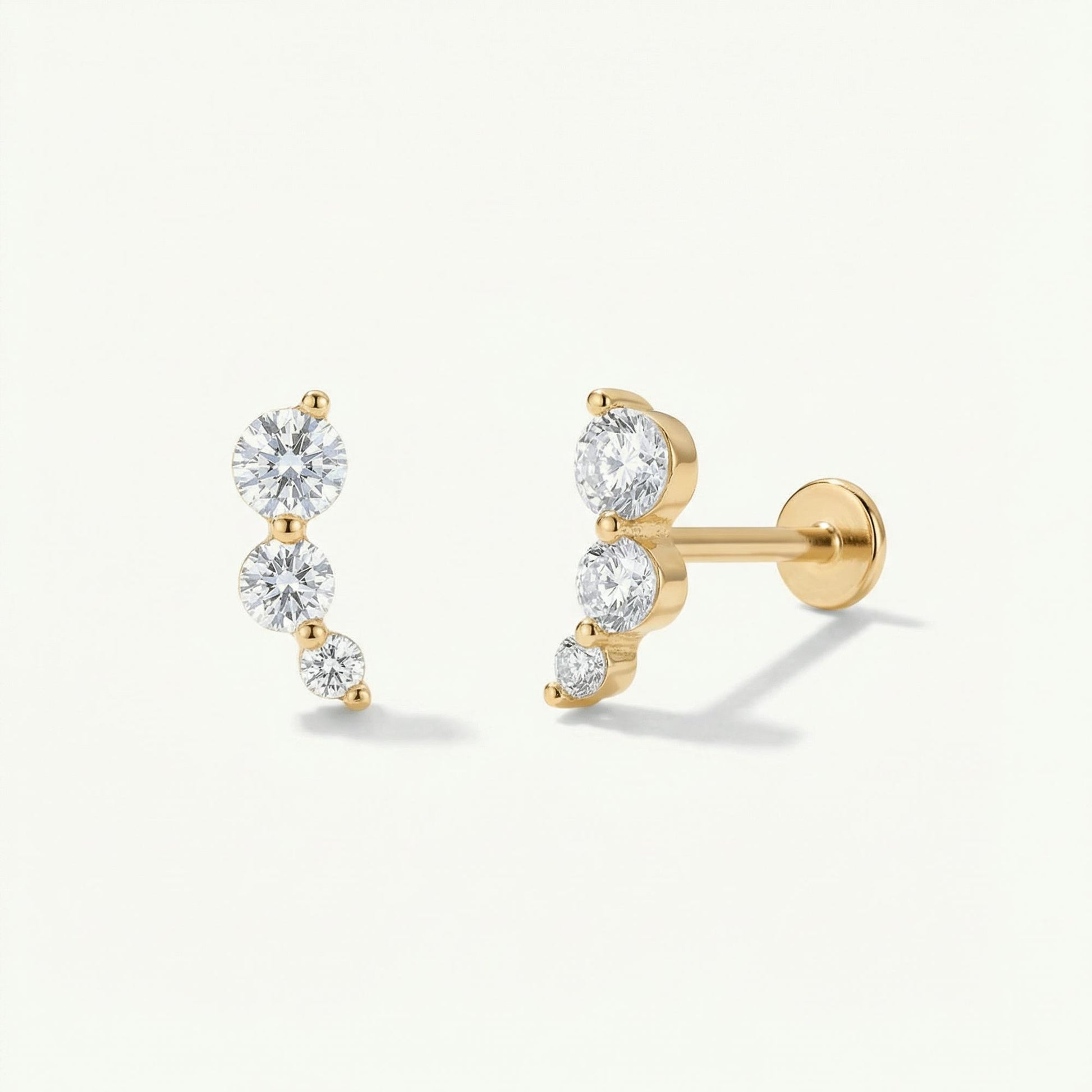 Three CZ Stone Flat Back Piercing Stud 14K Solid Gold