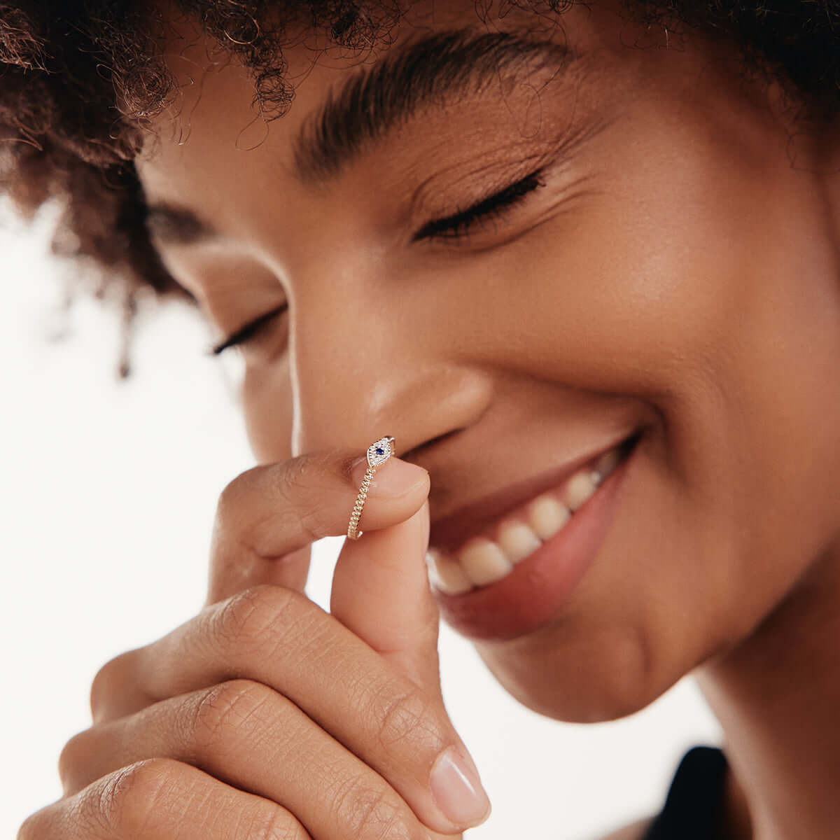 Beaded Diamond and Sapphire Evil Eye Ring 14K Solid Gold