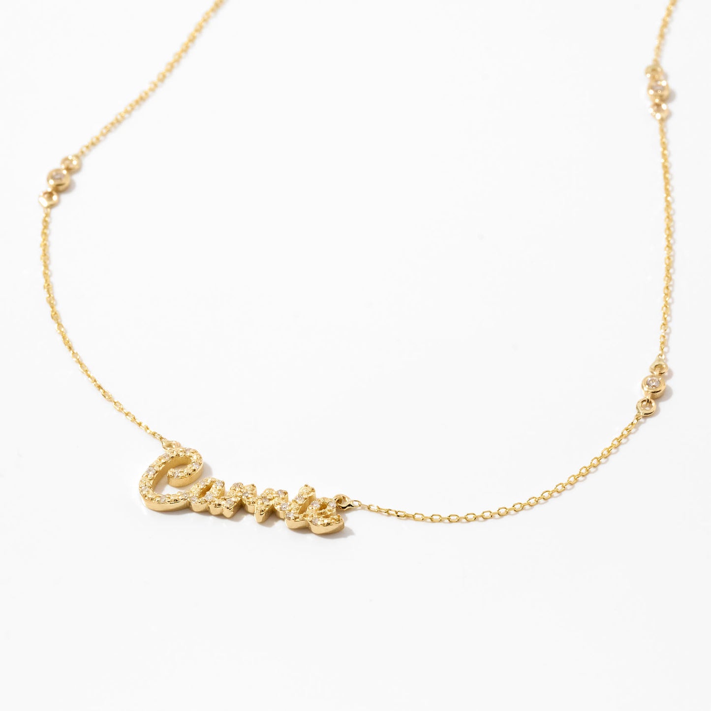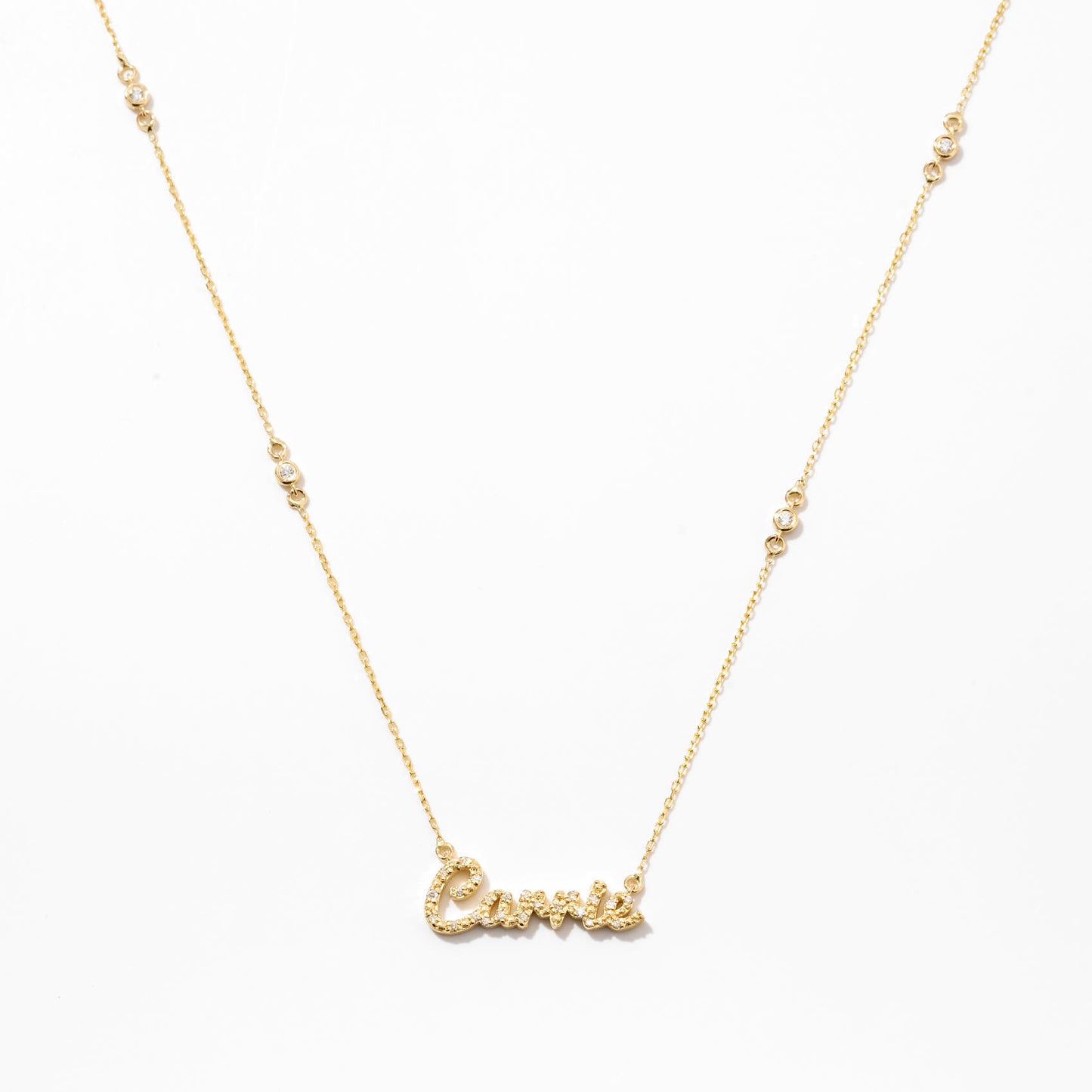 Timeless in its appeal, the Diamond Carrie Name Necklace in 14k Solid Gold is the epitome of luxury and personalization. This handcrafted piece, adorned with sparkling diamonds, offers a unique way to express your individuality. Perfect for everyday wear or special occasions, this name necklace is more than just a fashion accessory, it's a statement of elegance and sophistication. The high-quality 14k solid gold ensures durability while the meticulous design reflects exceptional craftsmanship. Whether you're looking for the perfect gift or a treat for yourself, this diamond name necklace is a stunning choice that promises to shine on any occasion.