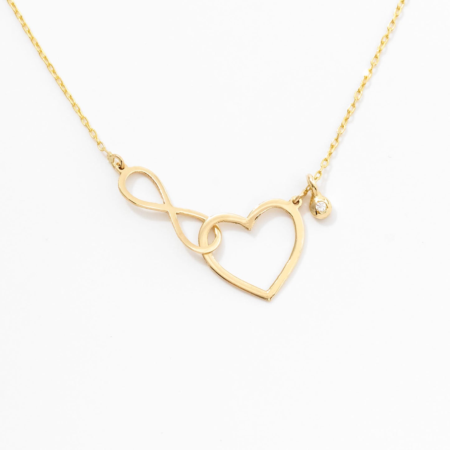 Crafted meticulously from 14k solid gold, this Small Heart-Infinity Necklace with a Diamond is an emblem of everlasting love. Its dazzling diamond accent adds a sophisticated touch, making it an ideal accessory for any occasion. This timeless jewelry piece, combining elegance and durability, is perfect for those seeking high-quality, stylish necklaces online. Experience the allure of gold and diamonds, seamlessly merged in this heart-infinity necklace, designed to captivate hearts and enhance your style.