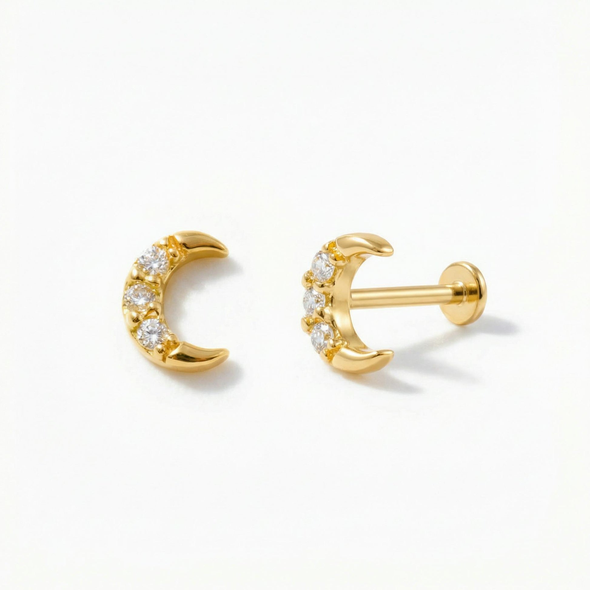 Crescent Moon Diamond Stud Earring 14K Solid Gold