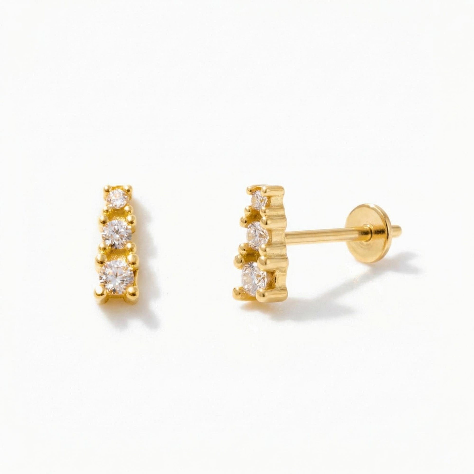 3 Stones Threaded Stud Earring 14K Solid Gold