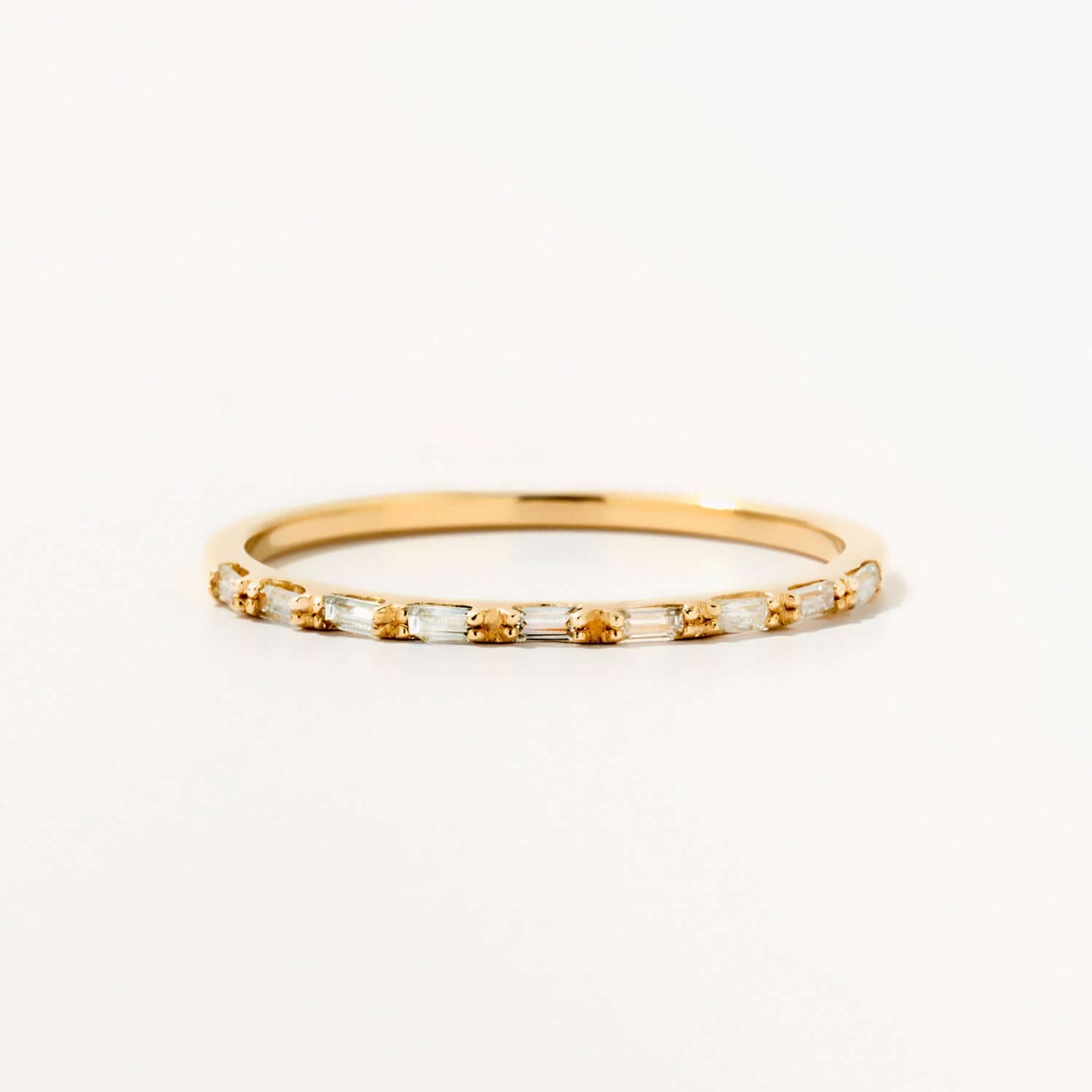 Exclusive 14K Solid Gold Baguette Wedding Band, a 9-stone CZ Baguette Ring, is a perfect statement of elegance for women. This 14k gold stacking ring, a baguette half-eternity ring, offers timeless beauty and dainty gift options. Its unique design and top-quality materials enhance its charm, making it an ideal choice for weddings, anniversaries, or everyday wear. This ring is not just a piece of jewelry, but a symbol of everlasting love and commitment.