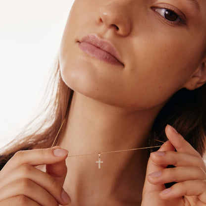 The CZ Pave Cross Pendant Necklace in 10K Gold is a stunning piece that combines elegance and spirituality. Crafted with meticulous attention to detail, this necklace features a delicate cross pendant adorned with sparkling zirconia stones, making it a meaningful and stylish accessory for any occasion.
