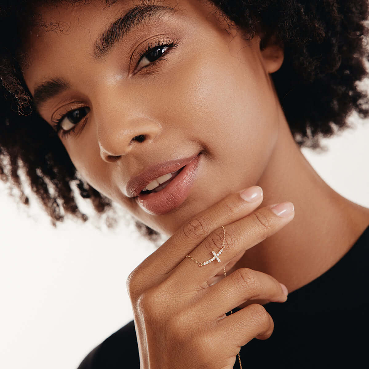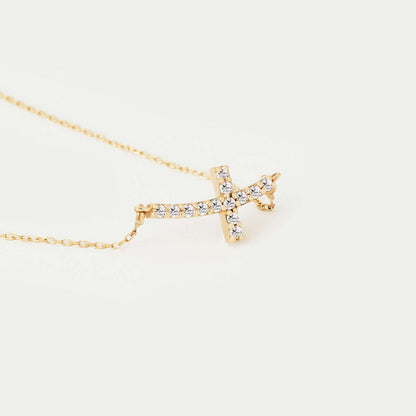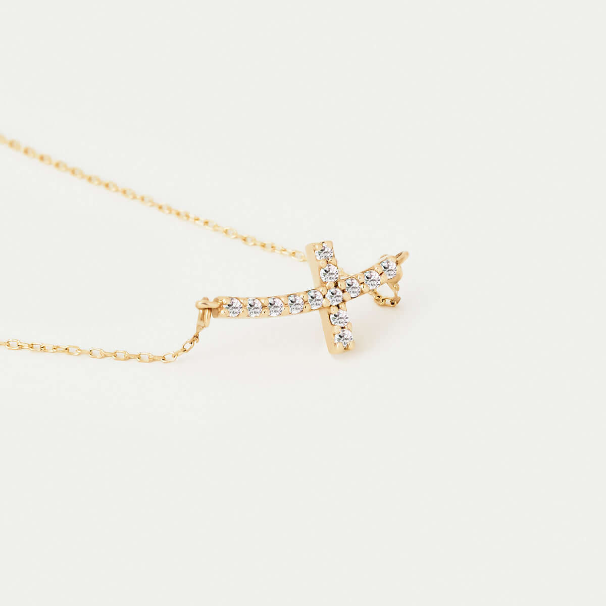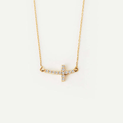 This Diamond Curved Cross Necklace in 10K Gold is a striking symbol of faith and fashion for women. Showcasing a pave of sparkling diamonds on a horizontal cross, this real 10K gold jewelry piece is the perfect Christian gift. It stands out for its unique curved design, adding a modern twist to a timeless classic. Be it for daily wear or special occasions, this necklace is sure to make a statement.