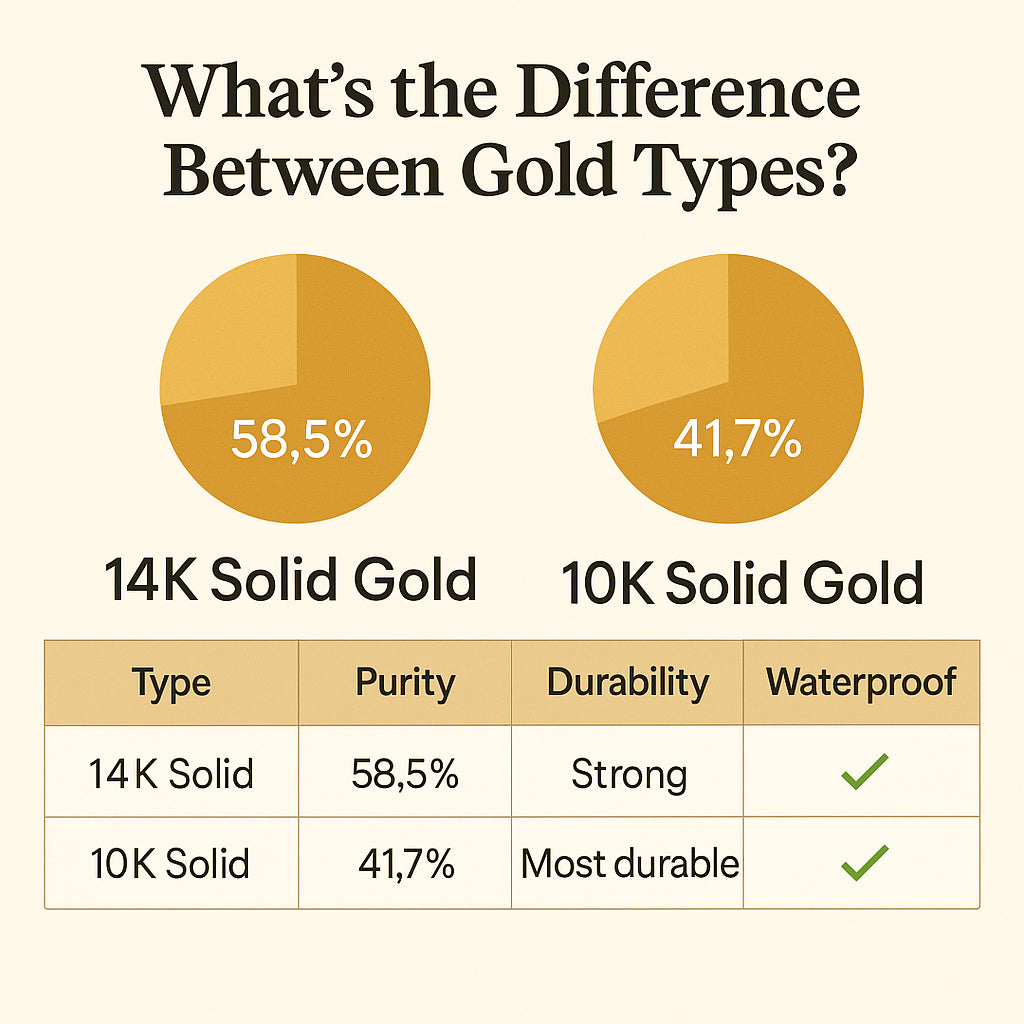 10K Solid Gold: All of your choices will be long-lasting, nature-friendly, and recycled gold. 10k solid gold doesn’t oxidize, discolor or lose its shine. It’s your perfect choice for everyday occasions.